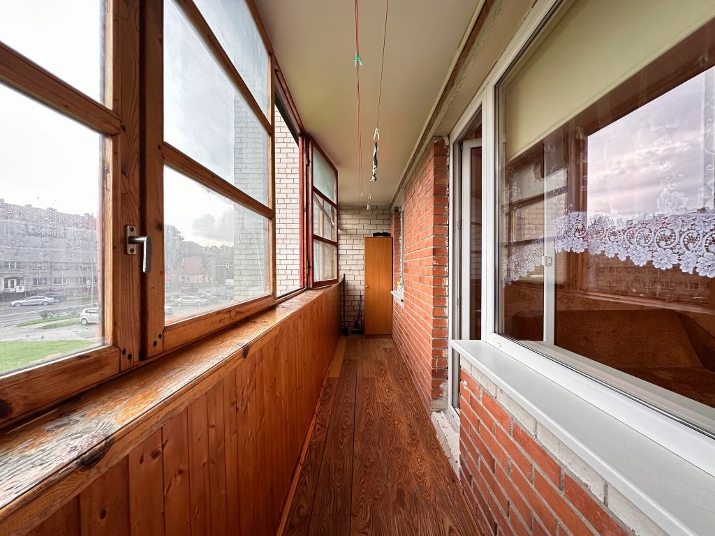 • Erdvus įstiklintas balkonas (~6 kv. m, mediniai langai)